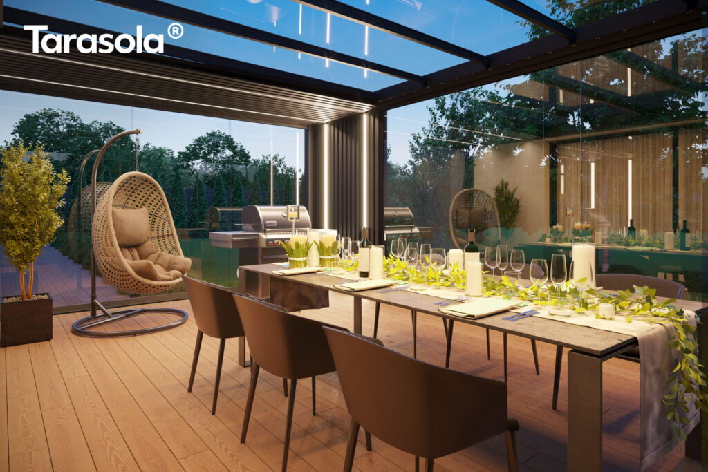 Stwórz sobie luksusową jadalnię z pergolą Tarasola z szklanym zadaszeniem, który otworzy widok na rozgwieżdżone niebo podczas kolacji. Ustaw duży stół z litego drewna otoczony rattanowymi krzesłami z poduszkami, dopełnij dekoracjami z świecami. Szklane zadaszenie ochroni przed deszczem w niepogodę i jednocześnie odsłoni widok na czyste rozgwieżdżone niebo z pełnią księżyca. Przezroczyste szkło hartowane przepuszcza maksymalnie światła dziennego, a wieczorem tworzy wrażenie kolacji wprost pod gwiazdami – z komfortem dachu nad głową.