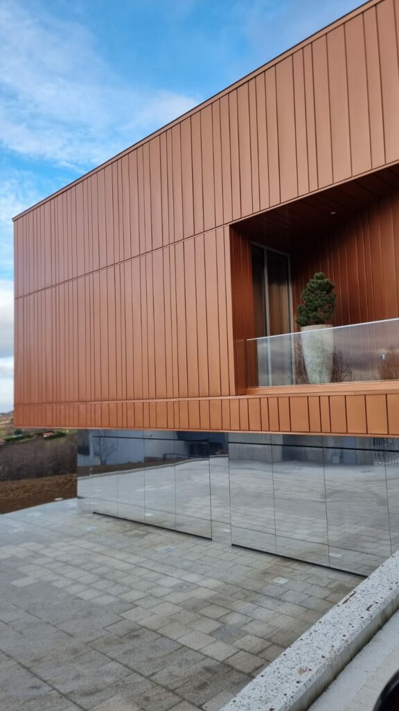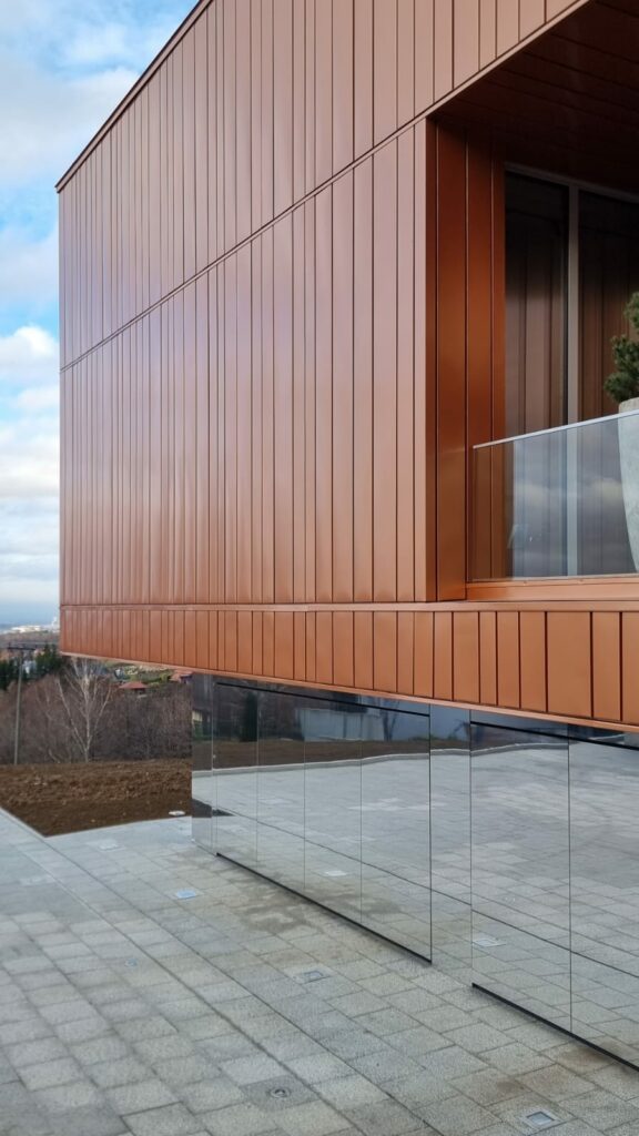Model N500 i ET500 pozwala na zastosowanie dowolnego rodzaju poszycia – w tej realizacji użyto lustrzanych płyt, które tworzą jednolitą płaszczyznę z elewacją. Brama staje się praktycznie niewidoczna, wtapiając się w nowoczesną bryłę budynku.