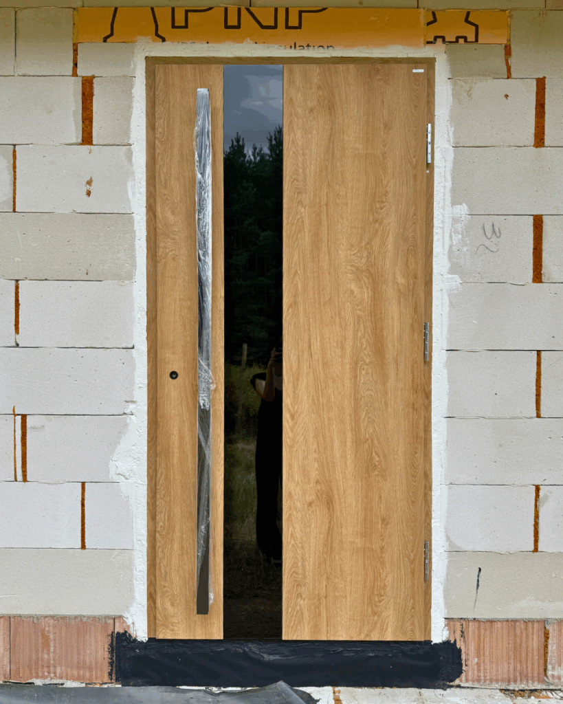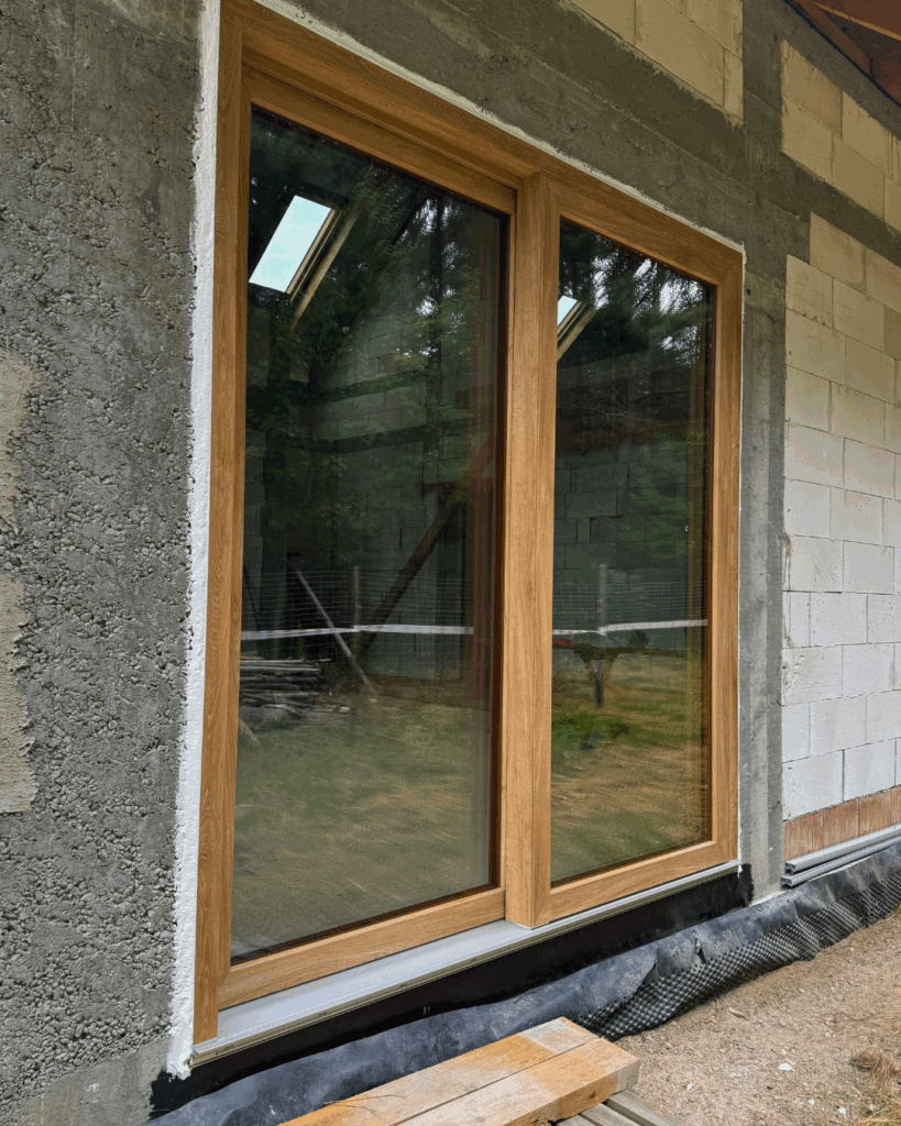 Zainstalowaliśmy drzwi tarasowe HST 2360 × 2430 od producenta OKNOPLAST w kolorze Woodec Turner Oak Malt. Montaż wykonano na podwalinach z purenitu, a szczelność zapewnia uszczelnienie EPDM oraz system montażowy Tytan Wins, gwarantując maksymalną ochronę przed wiatrem i wilgocią.