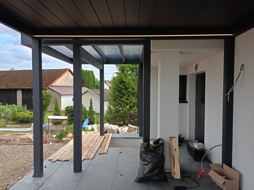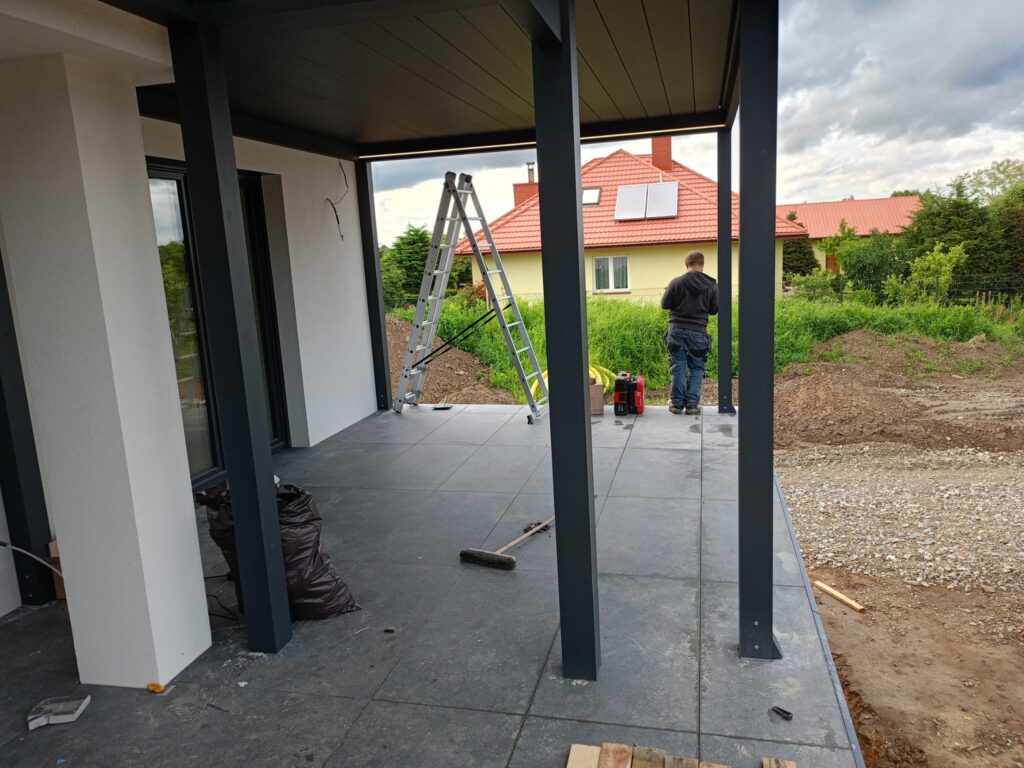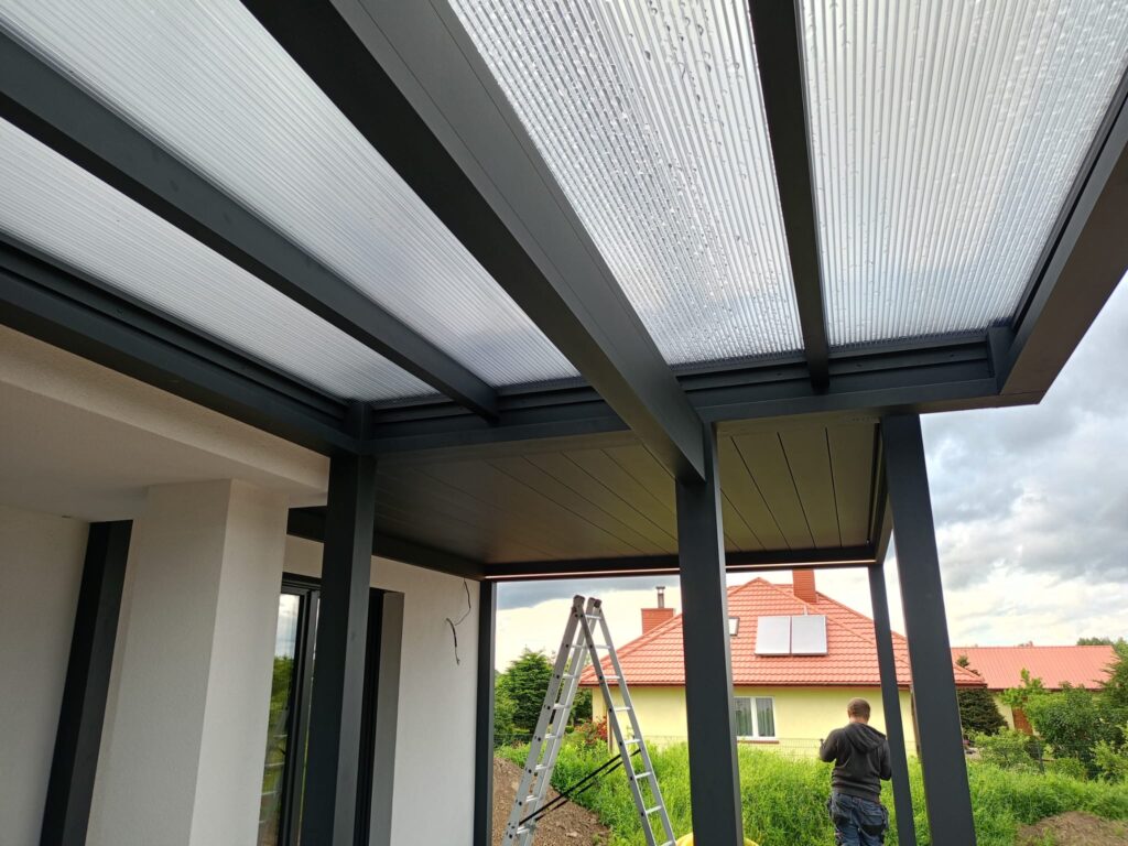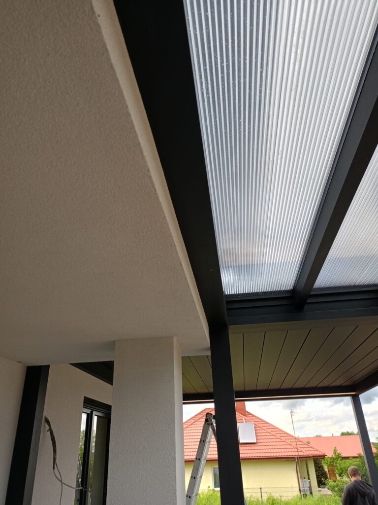 Zadaszenia zostały zamontowane do wcześniej przygotowanej przez Klienta powierzchni – zgodnie ze sztuką budowlaną i z zachowaniem wszystkich pionów i poziomów. Konstrukcja aluminiowa w połączeniu z poliwęglanem zapewnia wysoką odporność na wiatr (do 120 km/h) i śnieg (nawet 200 kg/m²).