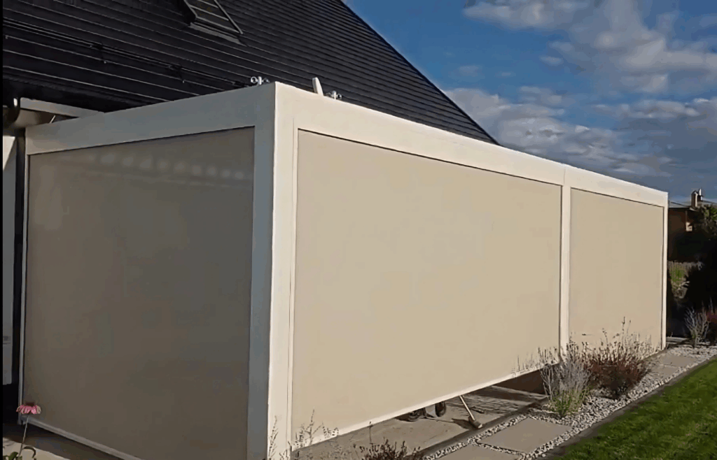 Zastosowane screeny ZIP z tkaniną Serge 600 pozwalają osłonić się przed słońcem, wiatrem i wzrokiem sąsiadów, a jednocześnie przepuszczają światło dzienne, zachowując przyjemny klimat wewnątrz pergoli.