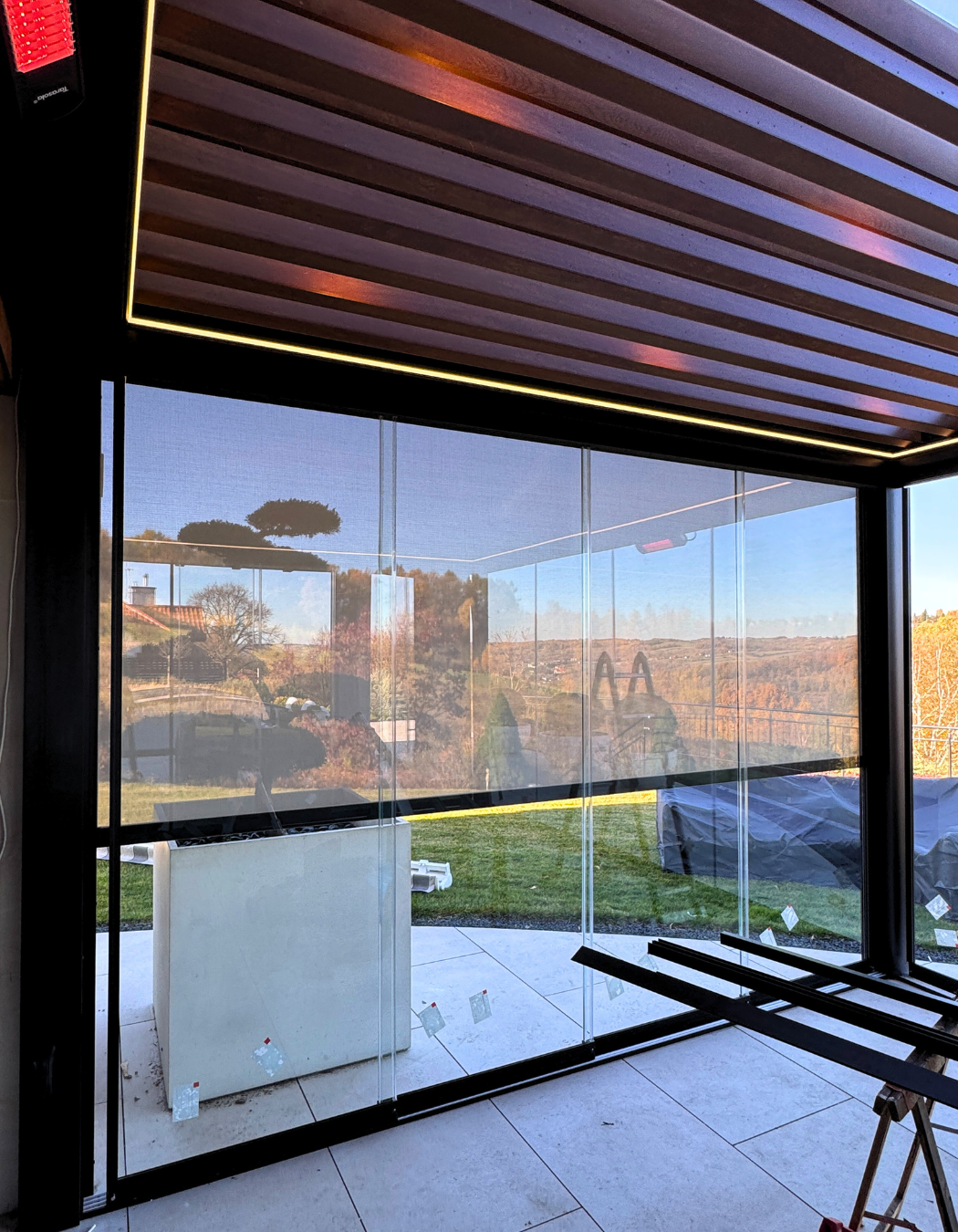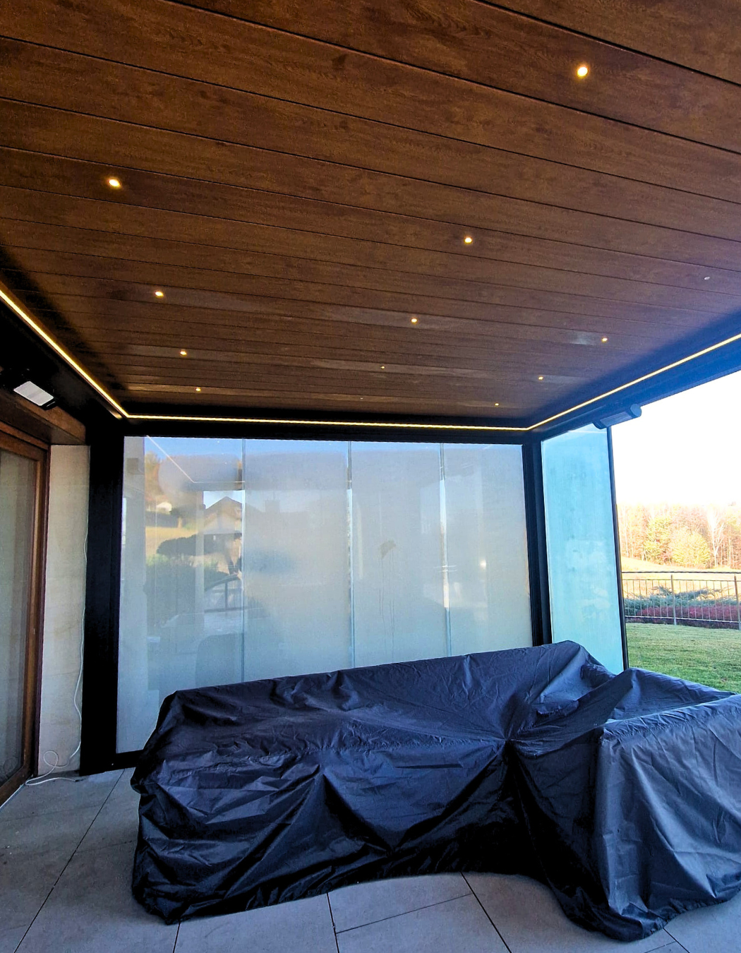 Roletę ZIP (356 × 250 cm) – chroniącą przed słońcem i deszczem, a w tym projekcie pełniącą również funkcję ściany projekcyjnej do oglądania filmów i meczów,