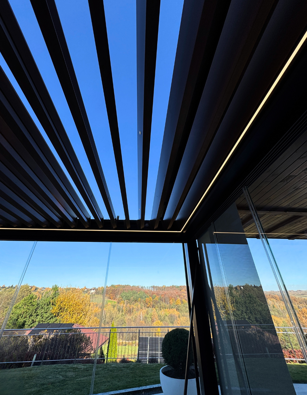 Dach pergoli tworzą ruchome lamele w drewnopodobnym odcieniu, które umożliwiają precyzyjną regulację ilości światła i skuteczną ochronę przed deszczem. System pełnej automatyki sterowania zapewnia maksymalny komfort użytkowania – wszystkimi funkcjami można sterować za pomocą pilota DAISY TELECO.