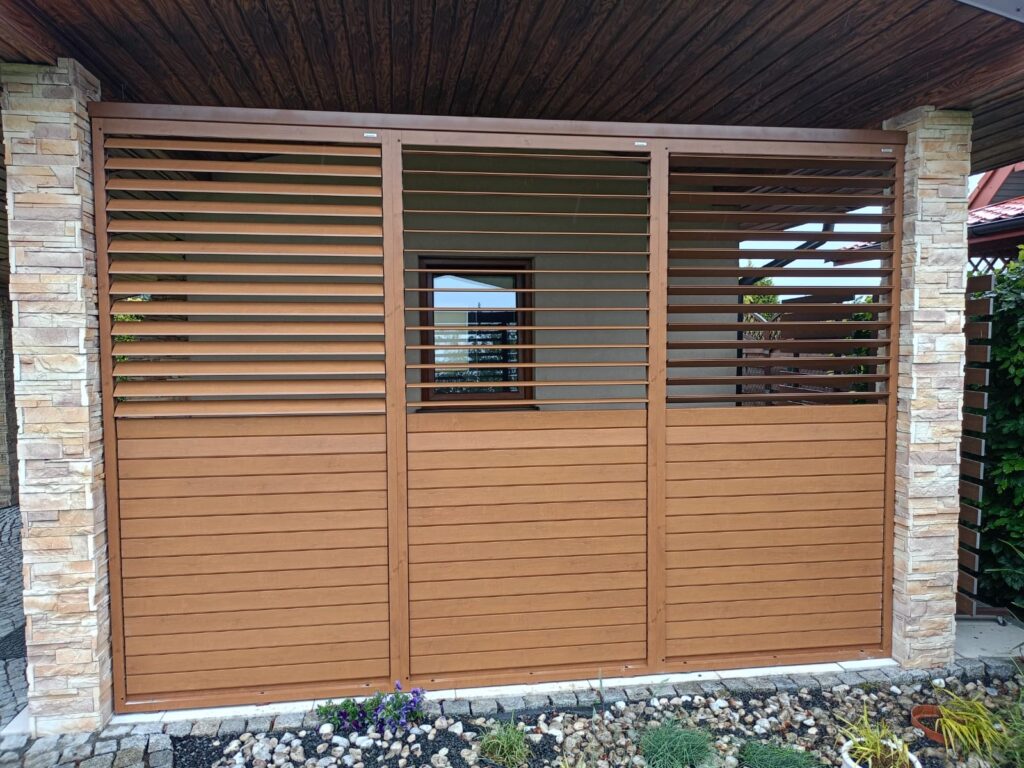 Shuttersy zostały wykonane w kolorze drewnopodobnym W2P22, co pozwoliło uzyskać naturalny wygląd drewna przy jednoczesnym zachowaniu wszystkich zalet aluminium – materiału odpornego na deszcz, promieniowanie UV i zmiany temperatur.