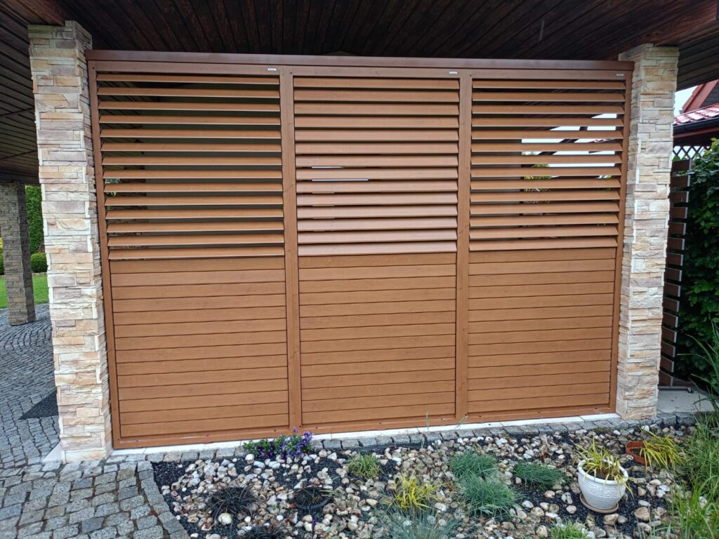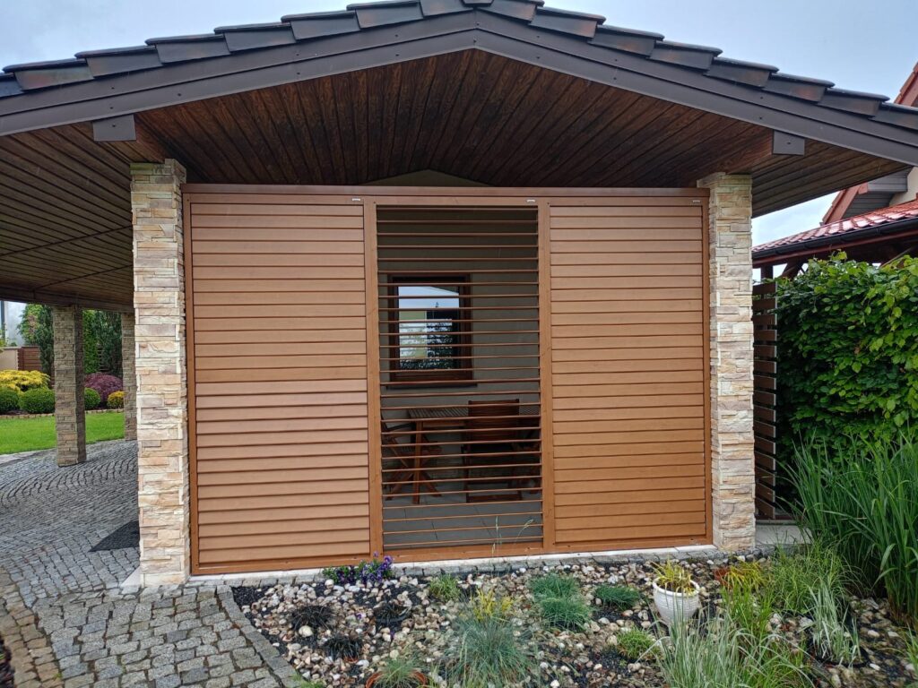 Shuttersy zostały wykonane w kolorze drewnopodobnym W2P22, co pozwoliło uzyskać naturalny wygląd drewna przy jednoczesnym zachowaniu wszystkich zalet aluminium – materiału odpornego na deszcz, promieniowanie UV i zmiany temperatur.